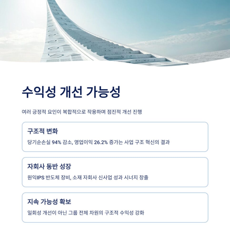수익성 개선 가능성은 구조적 변화에 기반하고 있다. 당기순손실 94% 감소와 영업이익 26.2% 증가는 일회성 개선이 아닌 사업 구조 혁신의 결과로, 수익성 개선 가능성의 지속성을 높게 평가하는 근거가 된다.