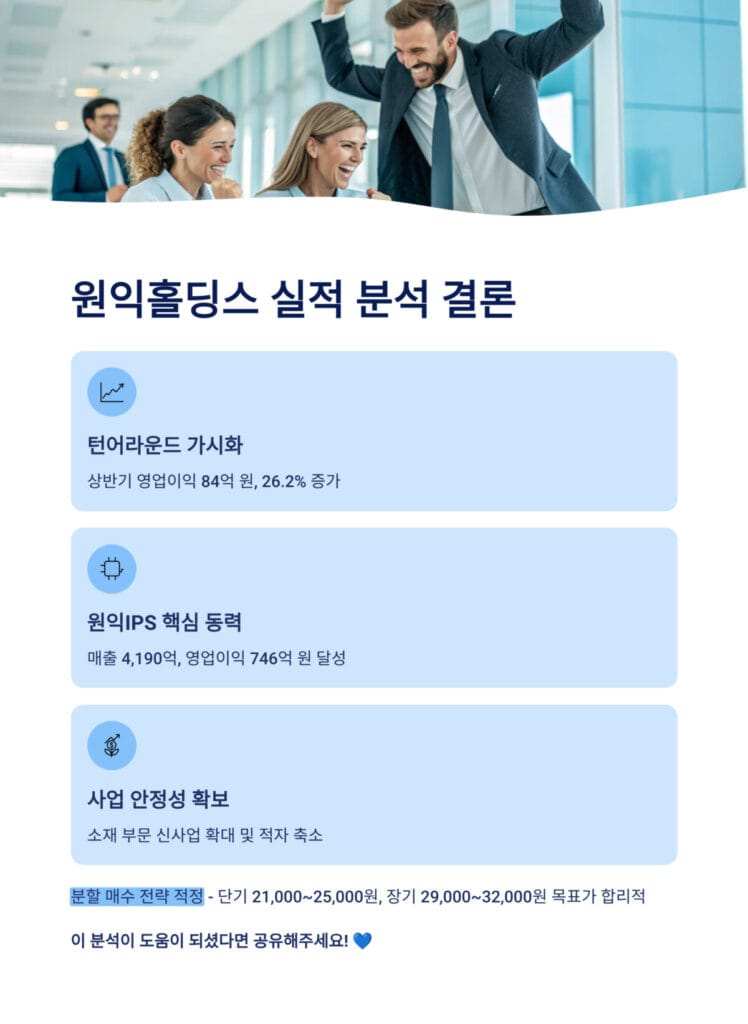 원익홀딩스 실적 분석에서 핵심은 원익IPS 기여도 확대입니다. 상반기 매출 4,190억 원(+13.2%), 영업이익 746억 원(+26.2%)으로 그룹 실적 개선의 핵심 엔진 역할을 하고 있습니다.